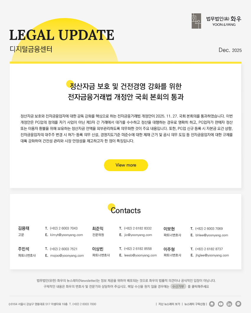 [법무법인(유한) 화우] 정산자금 보호 및 건전경영 강화를 위한 전자금융거래법 개정안 국회 본회의 통과